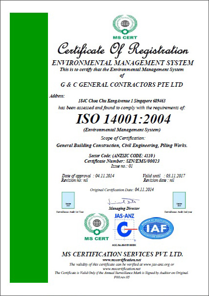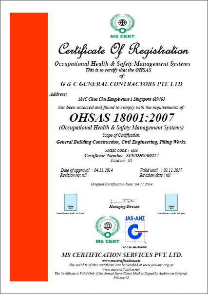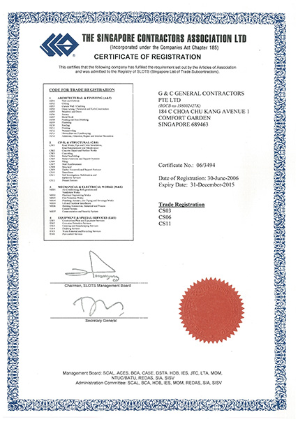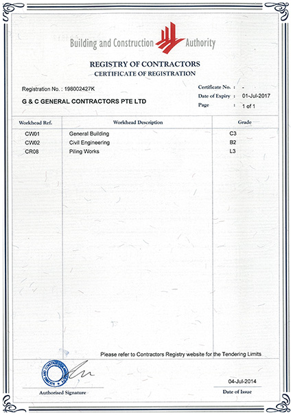 The company is a registered contractor with BCA and The Singapore Contractors Association Ltd (SLOTS) in Civil Engineering & Structural. We are an active contractor for the private sectors such as Keppel FELs LTD, Sumitomo Mitsui Construction Co. Ltd, Punj Lloyd Ptd Ltd, Shimizu Corporation, etc.